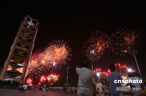 8月2日,北京奧運會開幕式第二次彩排在國家體育場“鳥巢”進行。圖為“鳥巢”上空煙花綻放。 中新社發(fā) 武仲林 攝