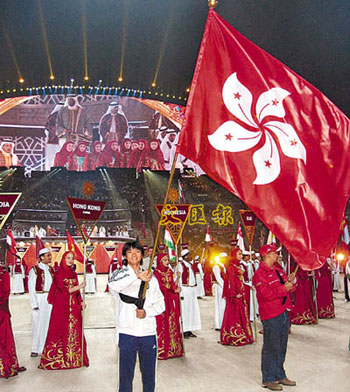 黃金寶將手持特區(qū)區(qū)旗走進(jìn)北京奧運(yùn)會(huì)。圖為多哈亞運(yùn)會(huì)。(圖片來源:文匯報(bào))