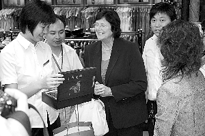 昨日,市場(chǎng)工作人員贈(zèng)送羅格夫人(中)一套《孫子兵法》竹簡(jiǎn)。
