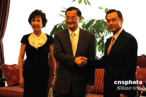 8月5日下午,中國(guó)國(guó)民黨榮譽(yù)主席連戰(zhàn)夫婦一行抵達(dá)北京首都機(jī)場(chǎng),將觀禮北京奧運(yùn)開(kāi)幕式。圖為中共中央臺(tái)辦主任王毅在機(jī)場(chǎng)貴賓室會(huì)見(jiàn)連戰(zhàn)夫婦一行。中新社發(fā) 王東明 攝