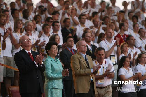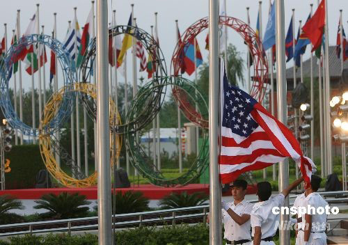 8月5日晚,參加北京奧運會的美國代表團在北京奧運村舉行升旗儀式,奧運村村長陳至立等出席。中新社發(fā) 武仲林 攝