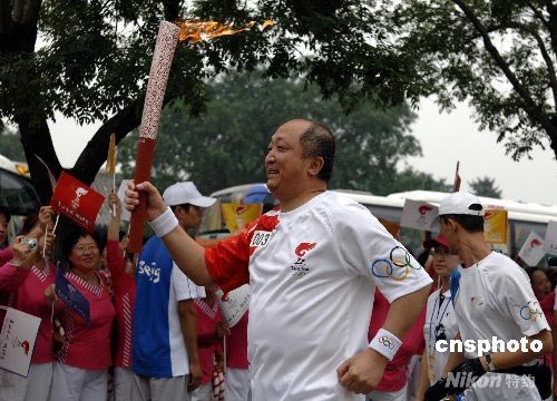 8月6日上午,奧運火炬北京站傳遞從午門正式開始。圖為著名作家劉冠軍擔任第3棒火炬手。中新社發(fā) 王東明 攝