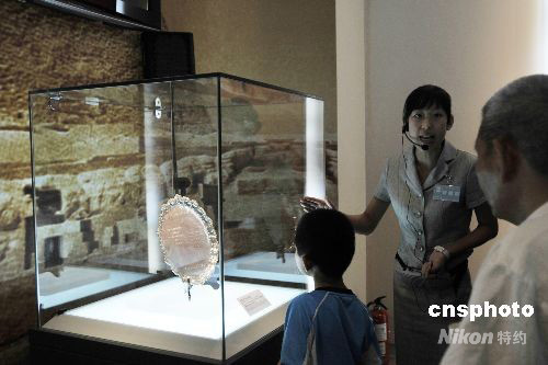 8月7日,北京奧運重要文化項目《世界瑰寶——中華人民共和國國際禮品展》在中國人民革命軍事博物館開幕。據(jù)悉,此次的國際禮品展堪稱中國國禮最全面的一次公開亮相。圖為講解員為參觀者介紹1963年阿拉伯聯(lián)合共和國蘇伊士運河管理局贈中國國務院總理周恩來的“銀刻字花邊圓盤”。中新社發(fā) 王宇婷 攝