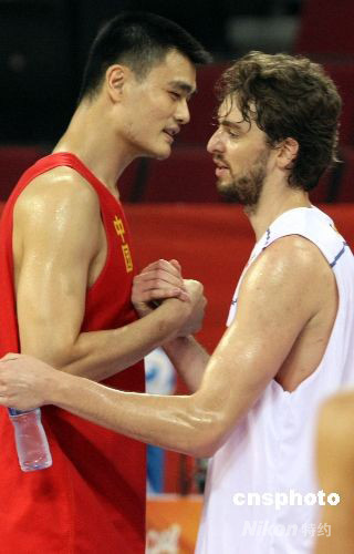 8月7日,世界冠軍西班牙男籃在北京奧運會籃球比賽館--五棵松籃球進行賽前的最后一場熱身訓練,效力于NBA洛杉磯湖人隊的超級球星保羅·加索爾(左)結束訓練后與前來訓練的中國隊超級中鋒姚明親切交談。中國與西班牙隊是同組死敵,按照實力分析中國隊擊敗世界冠軍西班牙隊的希望渺茫。 中新社發(fā) 任晨鳴