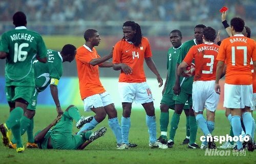 圖:奧運男足荷蘭14號隊員被紅牌罰下場 (3)