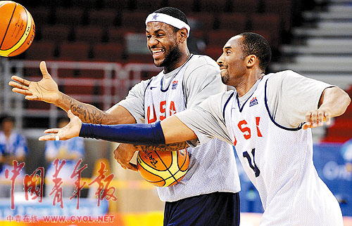 8月7日,科比(右)和詹姆斯在訓練中搶球。當日,美國男籃在五棵松奧運籃球館備戰(zhàn)8月10日與中國隊的比賽。 劉占坤攝