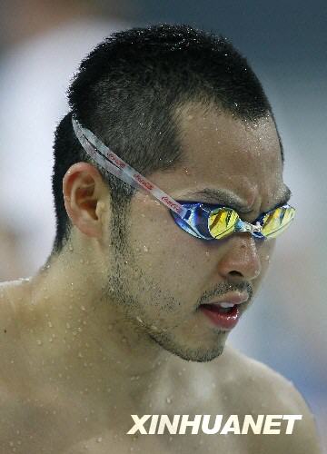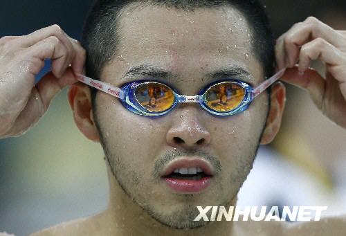 8月7日,日本游泳名將北島康介在下水前整理泳鏡。新華社記者丁旭攝