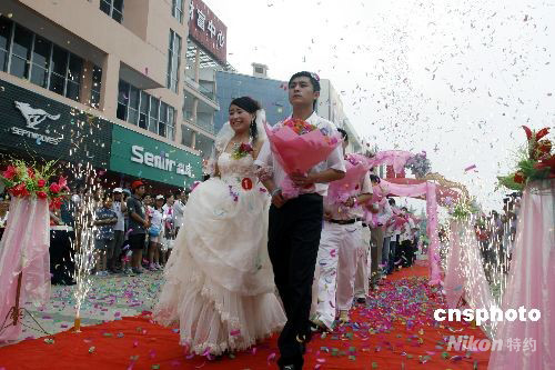 8月8日上午9時,江蘇邳州市十一對新人在市區(qū)最繁華的廣場,舉行集體婚禮,喜迎奧運(yùn)。中新社發(fā) 劉向鴻 攝