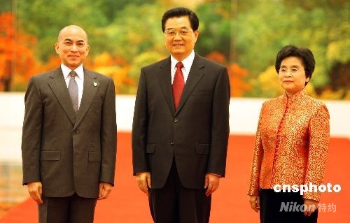8月8日中午,中國(guó)國(guó)家主席胡錦濤和夫人劉永清在北京人民大會(huì)堂為出席北京奧運(yùn)會(huì)的貴賓舉行歡迎宴會(huì)。圖為胡錦濤夫婦歡迎柬埔寨國(guó)王西哈莫尼。中新社發(fā) 任海霞 攝