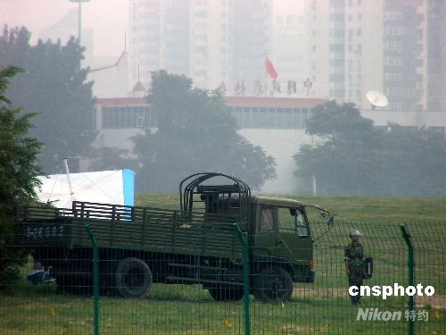 8月8日,新駐“鳥巢”周圍的中國武警防暴部隊嚴(yán)陣以待,保衛(wèi)北京奧運會開幕式的安全。包括解放軍三軍將士和保安、民兵、警察和武警在內(nèi)的多支武裝力量在此駐守,維護(hù)“鳥巢”周邊地面安全。中新社發(fā) 賈國榮 攝
