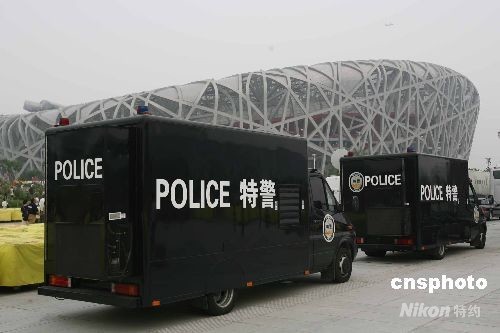 8月8日,第29屆夏季奧林匹克運(yùn)動(dòng)會(huì)即將于晚上8點(diǎn)揭幕,國(guó)家體育場(chǎng)“鳥(niǎo)巢”特警車(chē)輛場(chǎng)外戒備,保安嚴(yán)密。中新社發(fā) 武仲林 攝