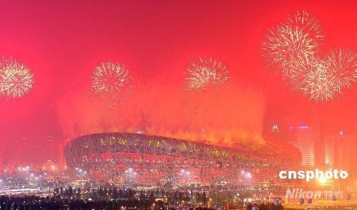 八月八日晚,第二十九屆奧林匹克運動會在北京開幕,煙花映紅北京夜空。中新社發(fā) 毛建軍 攝