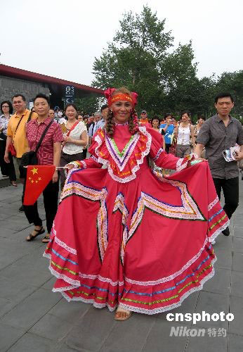 八月八日,北京奧運(yùn)會(huì)開幕式在“鳥巢”舉行。下午五時(shí)許,在北京十號(hào)線地鐵北土城的奧運(yùn)安檢出口,來自墨西哥的美女當(dāng)街盛裝熱舞。中新社發(fā) 許曉青 攝