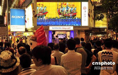 八月八日晚上,香港大批市民在銅鑼灣鬧市街頭上,觀看大屏幕電視直播的奧運(yùn)開幕盛況。中新社發(fā) 譚達(dá)明 攝