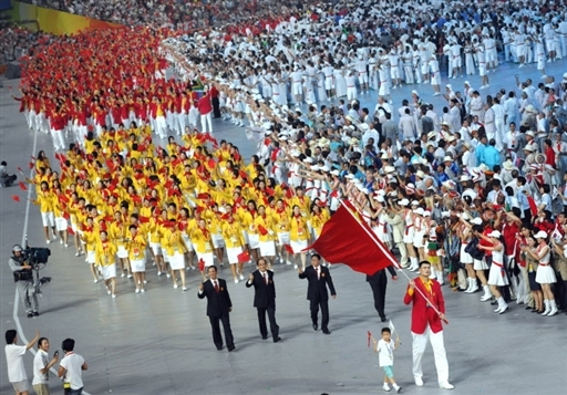 8月8日第29屆奧運(yùn)會(huì)開(kāi)幕,中國(guó)代表團(tuán)入場(chǎng),旗手為姚明,和姚明一同牽手進(jìn)入會(huì)場(chǎng)的是獲得英雄少年的光榮稱號(hào)的四川省阿壩州少年。
