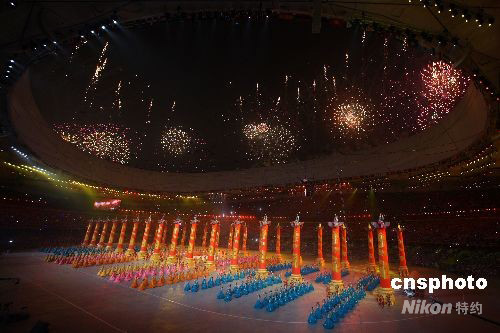 第二十九屆夏季奧運(yùn)會(huì)8月8日晚在北京奧林匹克公園內(nèi)的國家體育場舉行開幕式,禮花與中國禮樂表演構(gòu)成恢弘場面。中新社發(fā) 任晨鳴 攝