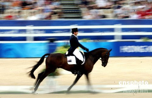 圖為首名登場的新西蘭選手圖·馬克(Todd Mark)在三項賽第一回合盛裝舞步賽中。中新社發(fā) 洪少葵 攝