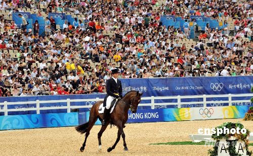 八月九日,北京奧運(yùn)馬術(shù)項(xiàng)目首日在香港沙田賽場舉行盛裝舞步賽事。此項(xiàng)比賽旨在考驗(yàn)馬匹的服從性、靈活性,騎手與馬匹須合作演出一連串精心設(shè)計(jì)的優(yōu)雅舞步動(dòng)作,因此,馬術(shù)盛裝舞步賽被稱為“馬術(shù)芭蕾”。 中新社發(fā) 鄧慶樂 攝