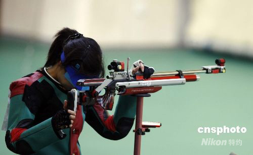 8月9日,北京奧運(yùn)會(huì)開(kāi)賽的第一天,女子10米氣步槍決賽在北京射擊館進(jìn)行。中國(guó)選手杜麗無(wú)緣金牌,捷克選手卡特日娜·埃蒙斯獲得首枚金牌,同時(shí)也是北京奧運(yùn)會(huì)產(chǎn)生的首枚金牌。中新社發(fā) 盛佳鵬 攝