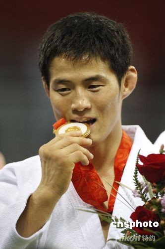 男子柔道60公斤級冠軍崔敏浩品嘗金牌滋味。