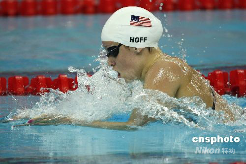 女子400米個(gè)人混合泳世界紀(jì)錄保持者、在美國(guó)泳壇同菲爾普斯并稱“金童玉女”的凱蒂·霍夫順利晉級(jí)半決賽。 中新社發(fā) 杜洋 攝