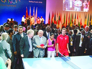 在當(dāng)天的奧運(yùn)法語大家庭聚會中,場地中央設(shè)置了一個乒乓球臺,而身著一身火紅色球衣的前比利時乒壇名將米歇爾·塞弗和中國乒乓球名將王濤、陳龍燦和江嘉良等數(shù)位乒乓球冠軍都成了當(dāng)天的“擂主”。來自法語國家組織的領(lǐng)導(dǎo)人紛紛拿起球拍“打擂”,體驗“小球的藝術(shù)”。