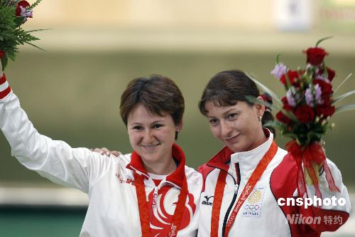 8月10日,北京奧運(yùn)會(huì)女子10米氣手槍決賽在北京射擊館落下帷幕,中國選手郭文珺以492.3環(huán)勇奪金牌,俄羅斯選手納塔利婭·帕杰林娜總分489.1環(huán)位列第二獲得銀牌,格魯吉亞老將妮諾·薩盧克瓦澤以487.4環(huán)的成績奪得銅牌。 圖為帕杰林娜(左)與薩盧克瓦澤在領(lǐng)獎(jiǎng)臺上親密合影。 中新社發(fā) 盛佳鵬 攝