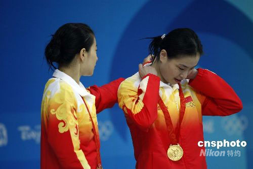 8月10日,素有“夢之隊(duì)”之稱的中國跳水隊(duì)黃金組合郭晶晶和吳敏霞輕松獲得女子雙人三米板金牌。圖為郭晶晶在領(lǐng)獎臺上幫吳敏霞整理衣領(lǐng)。中新社發(fā) 杜洋 攝