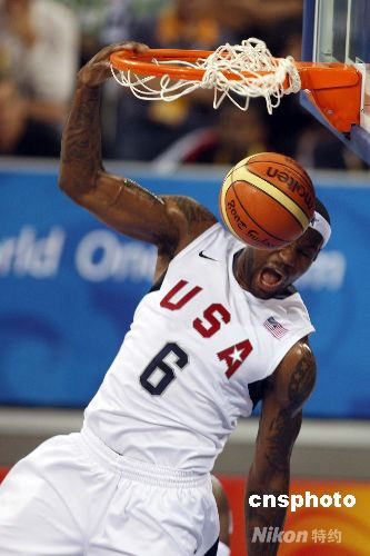 8月10日,奧運(yùn)男子籃球比賽中國男籃與美國男籃的比賽在北京五棵松籃球館正式開打。圖為美國6號隊員“小皇帝”詹姆斯飛身扣籃。中新社發(fā) 盛佳鵬 攝