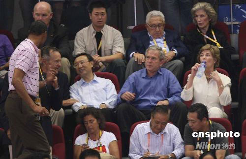 圖:北京奧運(yùn)會(huì)中美男籃大戰(zhàn) 布什父子觀戰(zhàn)