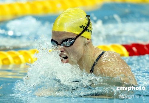 8月10日,澳大利亞著名選手瓊斯在女子100米蛙泳預(yù)賽中以1分05秒64的成績,打破了由羅雪娟創(chuàng)造的1分06秒64的奧運會紀錄。中新社發(fā) 杜洋 攝