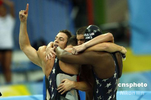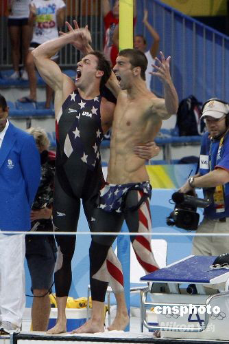 8月11日,美國隊奪得北京奧運會男子4x100米自由泳接力險勝法國,奪得該項目的金牌,并打破世界紀錄。 中新社發(fā) 杜洋 攝