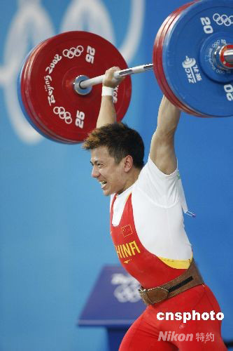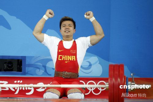 8月11日,北京奧運(yùn)會(huì)開賽的第三天,男子舉重62公斤級(jí)的決賽在北京航空航天大學(xué)體育館拉開戰(zhàn)幕,中國選手張湘祥輕松摘得金牌。中新社發(fā) 盛佳鵬 攝