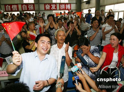 在8月11日下午舉行的北京奧運(yùn)會(huì)女子舉重58公斤級(jí)比賽中,蘇州姑娘陳艷青不負(fù)眾望,力奪冠軍,讓在蘇州觀看比賽的父母激動(dòng)萬(wàn)分。 中新社發(fā) 徐志強(qiáng) 攝