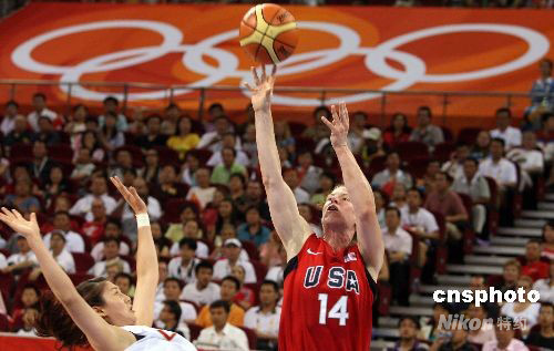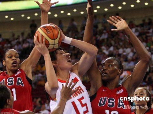 8月11日晚,北京奧運(yùn)會女子籃球中國隊(duì)與美國之戰(zhàn)在五棵松籃球館舉行,一心要奪取獎(jiǎng)牌的中國女籃以63-108慘敗給美國隊(duì)。中新社發(fā) 任晨鳴 攝