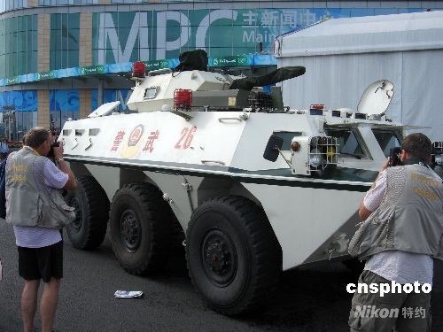 8月12日,一輛停在北京奧運會主新聞中心的前的武裝巡邏車引起了許多媒體的注意。中新社發(fā) 杜洋 攝