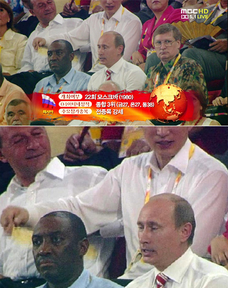 據(jù)韓國(guó)《朝鮮日?qǐng)?bào)》報(bào)道,這一視頻被上傳到美國(guó)YouTube網(wǎng)站,是對(duì)8日北京奧運(yùn)會(huì)開幕式現(xiàn)場(chǎng)直播的畫面進(jìn)行編輯的。當(dāng)俄羅斯代表團(tuán)入場(chǎng)時(shí),鏡頭對(duì)準(zhǔn)了坐在俄羅斯貴賓席上的俄羅斯總理普京,就在這時(shí),坐在普京身后的李明博也被拍個(gè)正著。