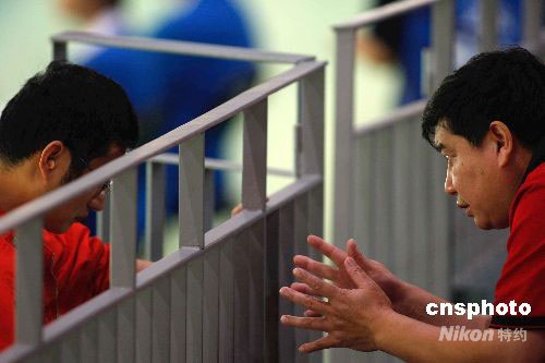 8月12日,北京奧運(yùn)會(huì)男子50米手槍比賽在北京射擊館開戰(zhàn),譚宗亮和林忠仔代表中國(guó)射擊隊(duì)出戰(zhàn)。圖為在資格賽中,主教練王義夫臨場(chǎng)指導(dǎo)譚宗亮。中新社發(fā) 盛佳鵬 攝