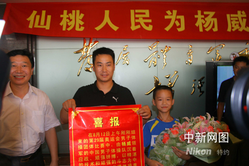 楊威率領(lǐng)中國(guó)體操男隊(duì)今日奪得奧運(yùn)會(huì)團(tuán)體金牌。十二日中午時(shí)分,當(dāng)消息傳到楊威的家鄉(xiāng)中國(guó)體操之鄉(xiāng)湖北仙桃市,早早守候在電視機(jī)前的當(dāng)?shù)孛癖娨黄序v,人們敲鑼打鼓,鞭炮齊鳴,熱烈慶賀仙桃籍運(yùn)動(dòng)員楊威再次獲得奧運(yùn)會(huì)體操男團(tuán)冠軍。