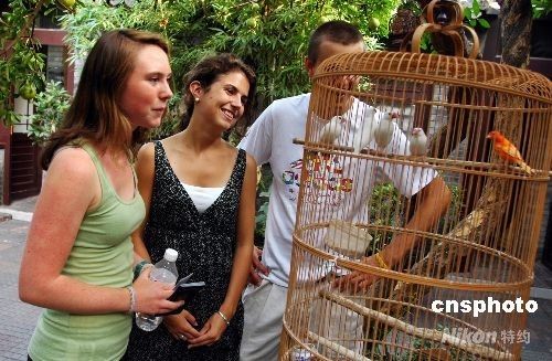 8月12日,首批美國學(xué)生來京觀看奧運會并入住“奧運人家”。他們是將要上大學(xué)的美國學(xué)生,克瑞斯表示很喜歡老北京的四合院,將在這里住3天。據(jù)悉,北京在奧運會期間共開設(shè)598戶“奧運人家”,可提供726間客房,能一次接待1000多名中外觀眾和游客。圖為他們很高興的欣賞四合院中的小鳥。中新社發(fā) 張雙雙 攝