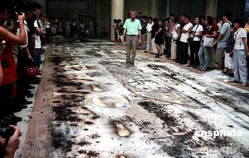 圖為蔡國強(qiáng)站在爆破畫上進(jìn)行最后檢閱。