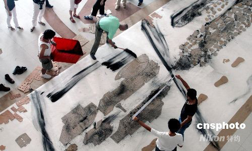圖為蔡國強(qiáng)在爆破前以掃走為筆進(jìn)行最后繪制。 中新社發(fā) 傅丹丹 攝