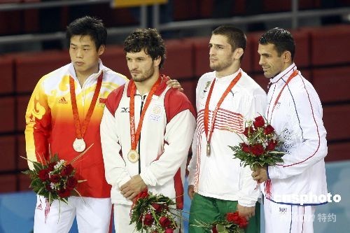 8月13日,在北京奧運(yùn)會(huì)摔跤男子古典式74公斤級(jí)冠亞軍決賽中,格魯吉亞選手馬努恰爾·克維克利亞以2-0戰(zhàn)勝中國選手常永祥,獲得男子古典式74公斤級(jí)金牌,常永祥獲得銀牌。保加利亞選手亞沃爾·亞娜基耶夫與法國選手克里斯托夫·蓋諾并列獲銅牌。中國選手常永祥獲得這枚銀牌的同時(shí),也創(chuàng)造了中國男子摔跤隊(duì)在奧運(yùn)會(huì)比賽的最佳成績(jī)。在此之前,中國男子摔跤隊(duì)在奧運(yùn)會(huì)上的最佳成績(jī)是第三名。中新社發(fā) 盛佳鵬 攝