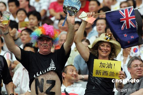 8月13日,北京奧運會男足小組賽,新西蘭VS比利時的比賽在上海體育場進行。熱情的新西蘭球迷打出中文標語為球隊加油,成為了場邊一道靚麗的風景。 中新社發(fā) 湯彥俊 攝