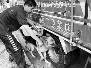 “特凱奧,上!”隨著軍犬訓(xùn)導(dǎo)員、二級士官劉紹鵬的一聲令下,1歲半的德國牧羊犬特凱奧竄到車前,開始用敏銳的嗅覺尋找危險(xiǎn)源。環(huán)繞一周后,它沖著車廂一角伏下了身子,不斷用低哮告訴大家“可疑目標(biāo)已經(jīng)找到”。經(jīng)過排查,原來是車廂里面角落的一小包木炭引起了儀器反應(yīng)。