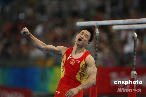 8月14日,中國奧運(yùn)“三朝元老”楊威在北京奧運(yùn)會(huì)體操男子個(gè)人全能決賽中力壓群雄,以94.575分,高出亞軍2.6分的較大優(yōu)勢(shì),奪得這塊體操個(gè)人項(xiàng)目中分量最重的金牌,他也成為繼李小雙之后中國體操的第二位個(gè)人全能奧運(yùn)冠軍。中新社發(fā) 武仲林 攝