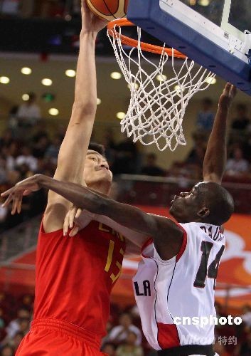 8月14日下午,北京奧運(yùn)會(huì)男子籃球小組第四輪賽事在北京五棵松籃球館舉行,同為兩戰(zhàn)兩負(fù)的中國(guó)隊(duì)與安哥拉隊(duì)展開“生死大戰(zhàn)”。身高2.26米的中國(guó)隊(duì)超級(jí)中鋒姚明開場(chǎng)扣籃得分。中新社發(fā) 任晨鳴 攝