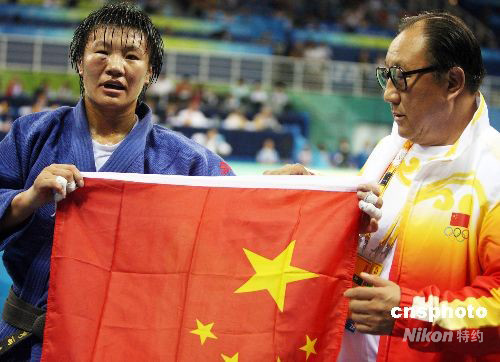 楊秀麗獲得金牌后,與中國(guó)柔道隊(duì)總教練劉永福向熱情的觀眾展示國(guó)旗。
