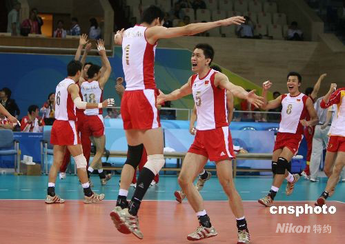 8月14日晚,中國隊在北京奧運會男子排球比賽中以3比2戰(zhàn)勝日本隊,提前鎖定8強席位。圖為中國隊隊員們歡慶勝利。 中新社發(fā) 武仲林 攝