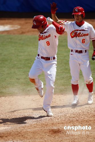 8月15日,北京奧運會棒球男子預(yù)賽在北京五棵松棒球場舉行,中國隊對陣中華臺北隊。最終中國隊經(jīng)過四個多小時的苦戰(zhàn),以8:7逆轉(zhuǎn)戰(zhàn)勝中華臺北隊。圖為中國隊9號張玉峰(左)慶祝得分。中新社發(fā) 盛佳鵬 攝